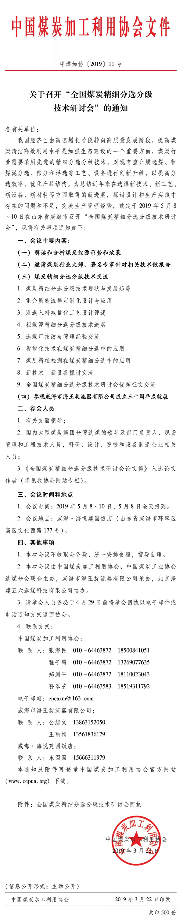 由中國煤炭加工利用協會主辦,威海市海王旋流器有限公司承辦的“全國煤炭精細分選分級技術研討會”定于2019年5月8-10日在山東省威海市召開,敬請關注!