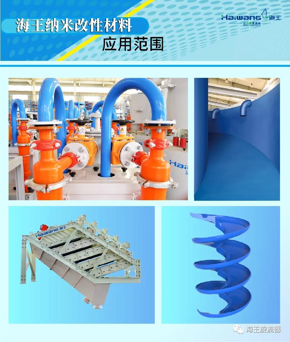 海王納米改性材料在礦山、煤炭、電力等多個行業應用成功,作為“硬核”的耐磨、耐蝕材料,可應用于旋流器、振動篩、螺旋分選機等設備的過流部位,也可應用于箱體、溜槽、漏斗、管路等非標設施過流部位。